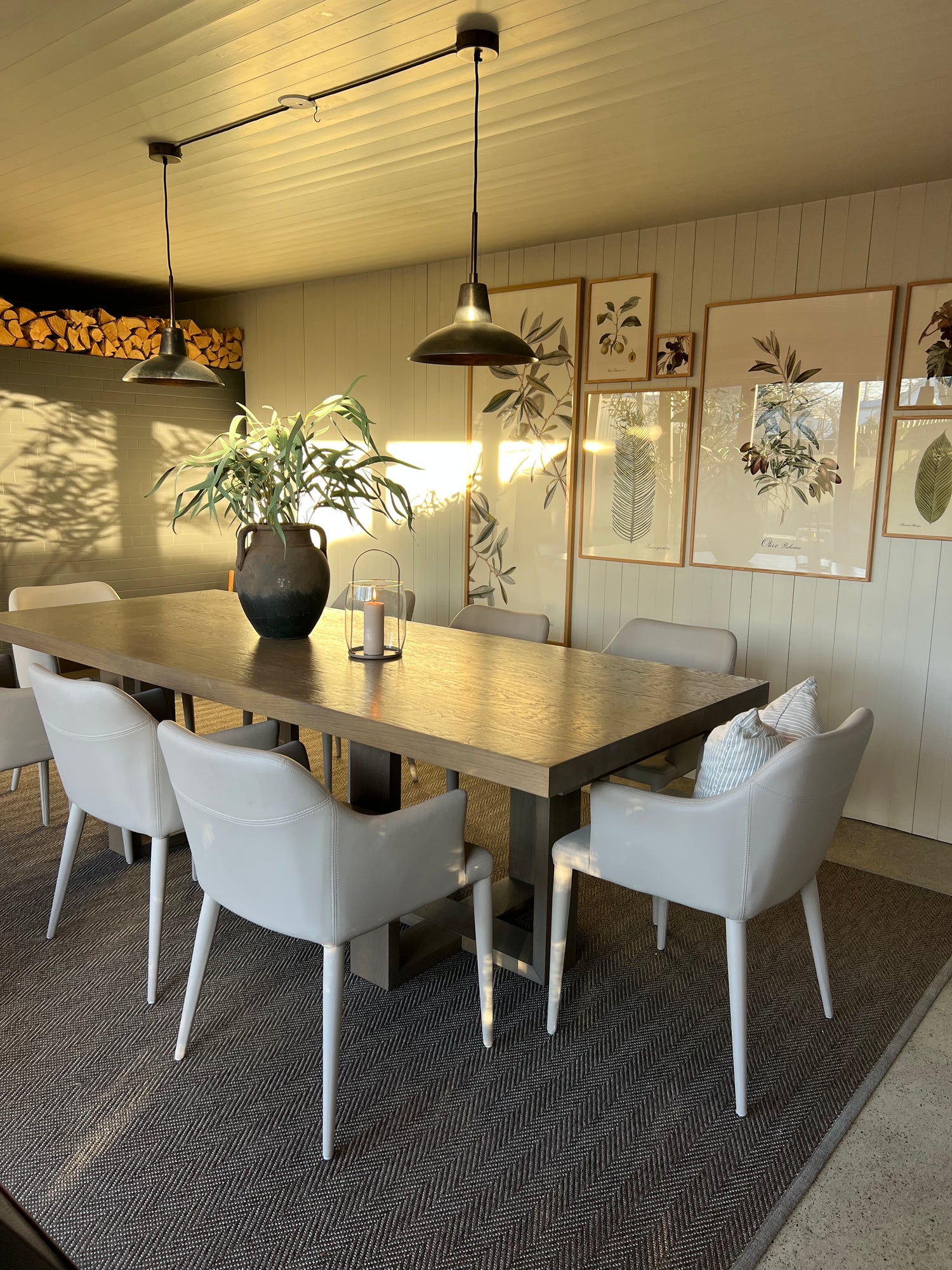 Med stemningsfulle lykter, dekorative elementer og nøye utvalgte bilder og detaljer, ble utestuen forvandlet til et personlig og varmt uterom. Nå inviterer rommet til gode samtaler og hyggelige kvelder – akkurat slik kunden ønsket det.