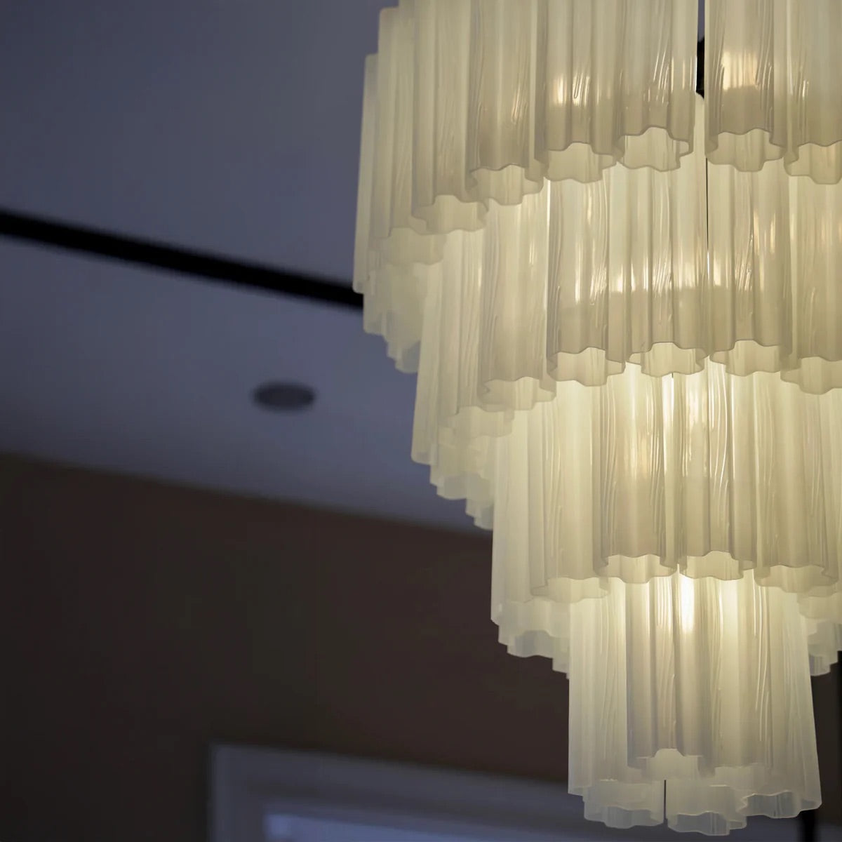 Fantastisk Fontaine lysekrone i fire lag. Velg mellom krom eller sort sokkel, og klart eller hvitt glass.