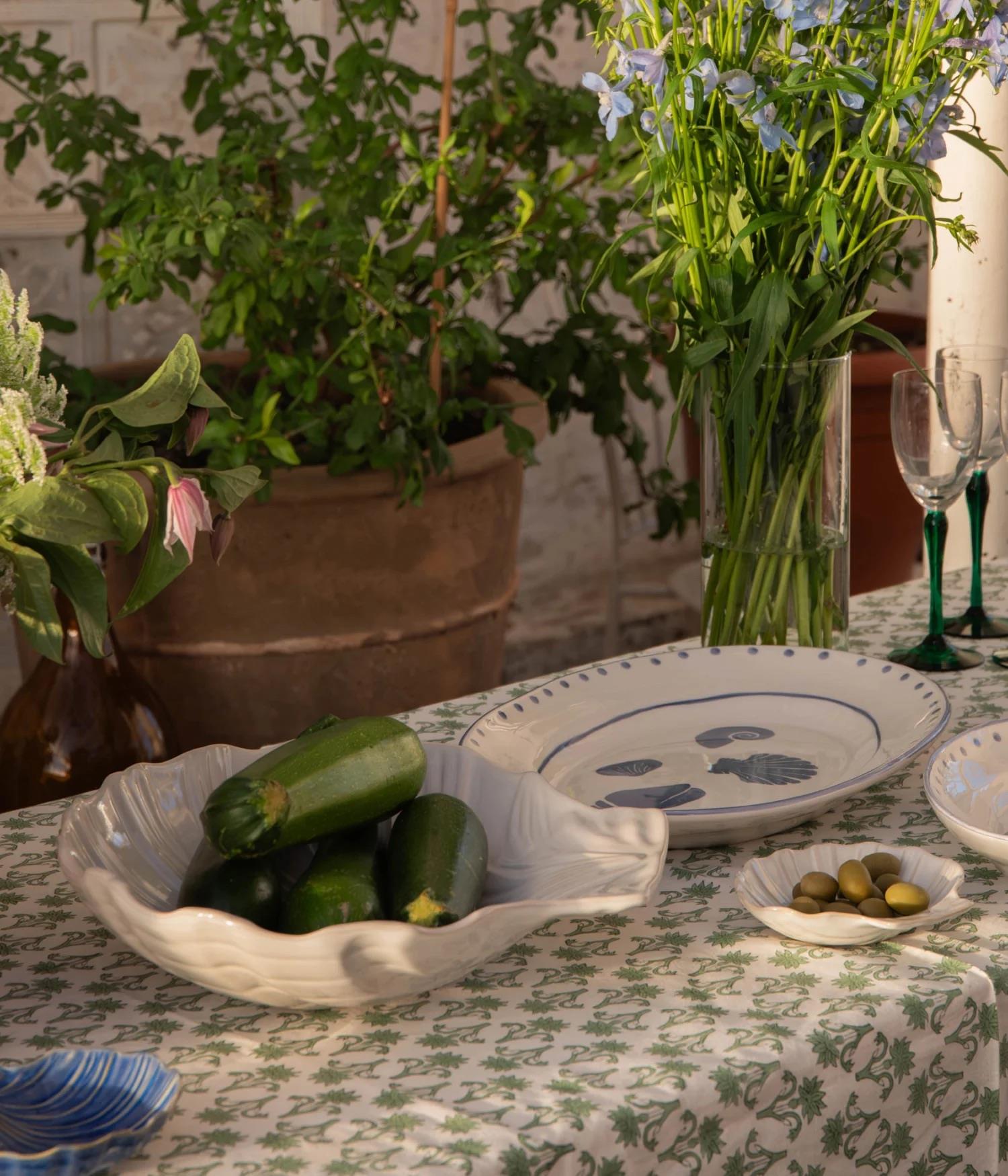 Dette produktet er en del av vår Marine-kolleksjon, ideelt for å servere salaten din i ekte kyststil. Håndlaget i steintøy med tradisjonelt håndverk fra Portugal, vår Shell-skål har en sjarmerende skallformet design med en håndmalt monokrom finish.